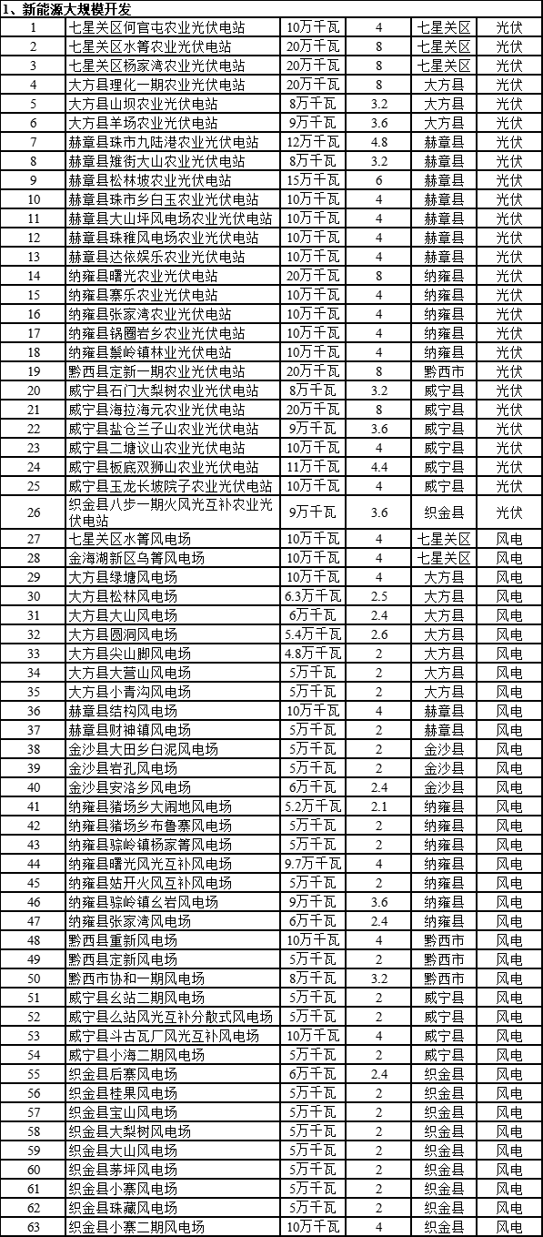 根據(jù)畢節(jié)市新型綜合能源基地建設(shè)重點項目表來看,涉及光伏、風(fēng)電、風(fēng)光制氫以及多能互補與源網(wǎng)荷儲一體化多個項目。其中光伏項目約26個,規(guī)模為3.19GW,風(fēng)電項目為37個,規(guī)模為2.374GW。多能互補以及源網(wǎng)荷儲項目為6個,規(guī)模為11.62GW,光伏1.45GW,風(fēng)電為1.8GW。其中,國家電投集團畢節(jié)千萬千瓦級綜合能源基地新能源規(guī)劃規(guī)模為8.37GW。
