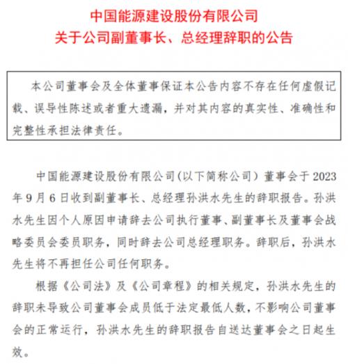 2023年9月6日,中國能建公告,公司董事會于2023年9月6日收到副董事長、總經理孫洪水的辭職報告。孫洪水因個人原因申請辭去公司執行董事、副董事長及董事會戰略委員會委員職務,同時辭去公司總經理職務。辭職后,孫洪水將不再擔任公司任何職務。