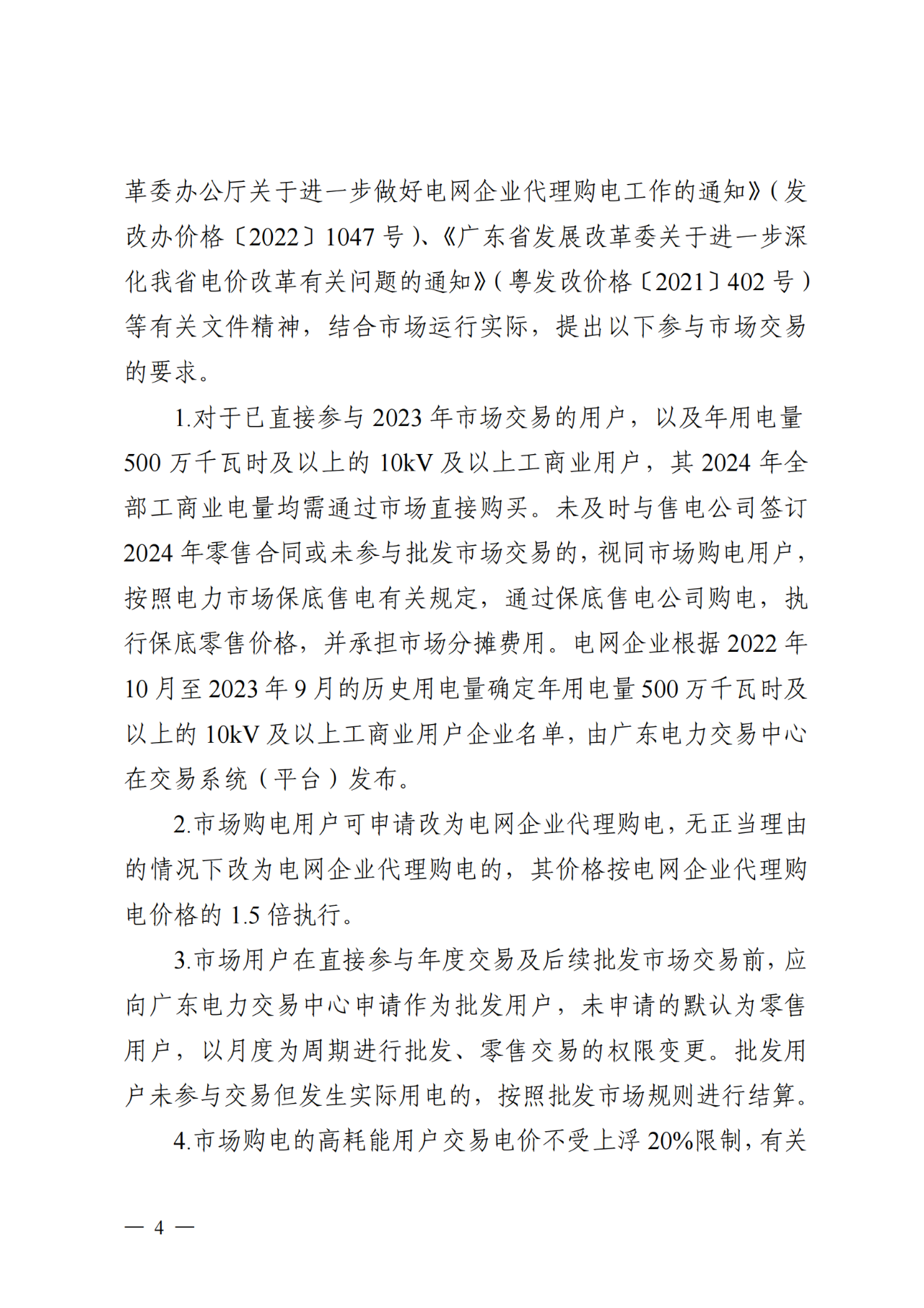 對于2023年已經參與市場交易的用戶,以及年用電量滿足500萬千瓦時的 10kV 及以上工商業用戶,2024年均需直接參與市場交易,未及時與售電公司簽訂2024 年零售合同或未參與批發市場交易的,將通過保底售電公司購電,執行保底零售價格,并承擔市場分攤費用。