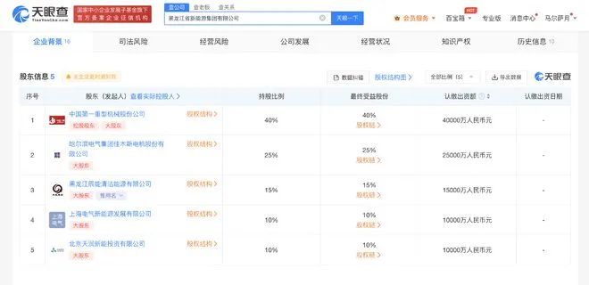 天眼查App顯示,11月20日,黑龍江省新能源集團有限公司成立,法定代表人為劉軼,注冊資本10億人民幣,經營范圍含新興能源技術研發、風電場相關系統研發、以自有資金從事投資活動、風力發電技術服務、太陽能發電技術服務、儲能技術服務、工程管理服務等。股東信息顯示,該公司由中國一重(601106)、佳電股份(000922)、黑龍江辰能清潔能源有限公司、上海電氣新能源發展有限公司、北京天潤新能投資有限公司共同持股。
