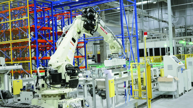 為了考驗AGV小車的反應能力,記者突然出現在小車前,只見小車減緩速度慢慢停下來,等著全無障礙物才開始行駛。隨后,記者跟隨這輛載著原棒的小車走進機加車間。只見小車一路行駛從廠房這頭準確無誤地“走”到廠房那頭,并將原棒毫無偏差地“投喂”給一個正在“上崗”的機械臂。