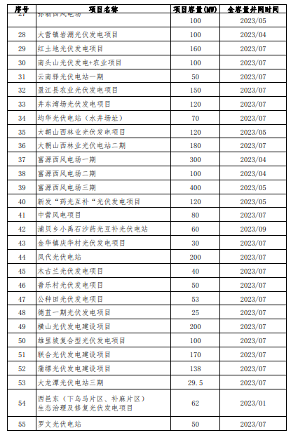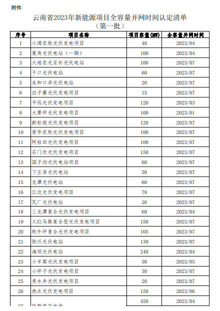 根據《云南省發展和改革委員會 云南省能源局關于云南省光伏發電上網電價政策有關事項的通知》(云發改價格〔2023〕319號)以及《云南省發展和改革委員會 云南省能源局關于進一步完善風電上網電價政策有關事項的通知》(云發改價格〔2023〕665號)文件精神,新能源全容量并網時間的認定由省能源局會同云南電網公司負責。為加強社會監督,廣泛征求意見,現將經認定后的項目清單予以公示,有關情況如下: