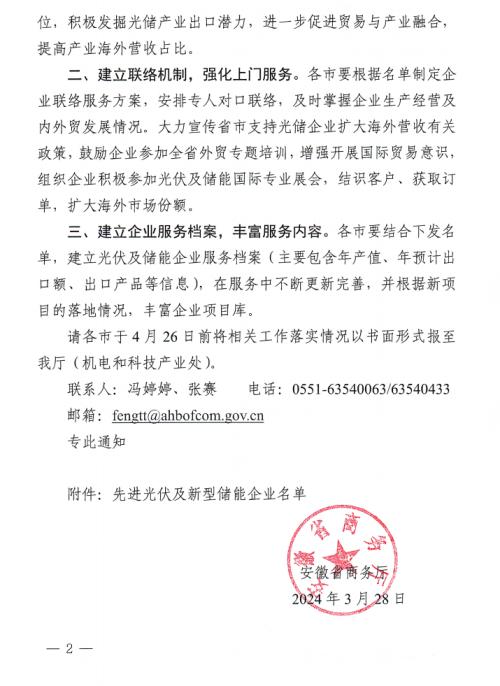 文件要求,各市要根據名單制定企業聯絡服務方案,安排專人對口聯絡,及時掌握企業生產經營及內外貿發展情況。大力宣傳省市支持光儲企業擴大海外營收有關政策,鼓勵企業參加全省外貿專題培訓,增強開展國際貿易意識組織企業積極參加光伏及儲能國際專業展會,結識客戶、獲取訂單,擴大海外市場份額。