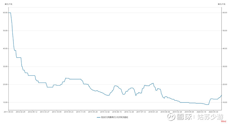 這是2011年至今的硅料價格,當年保利協鑫的產能釋放完畢,硅料價格從100美元/kg跌到20美元/kg。