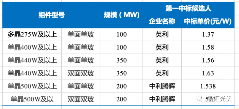然而,根據評標結果,實際多晶組件第一候選人價格為1.37元/W,單晶組件第一候選人價格在1.52~1.63元/W之間;因此,實際中標價格可能遠低于最高報價。