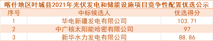 喀什地區(qū)葉城縣2021年光伏發(fā)電和儲(chǔ)能設(shè)施競(jìng)爭(zhēng)性配置于2021年3月19日在葉城縣人民政府網(wǎng)發(fā)布項(xiàng)目公告,于2021年3月27日16時(shí)在葉城縣建設(shè)工程交易中心會(huì)議室進(jìn)行優(yōu)選會(huì)議,優(yōu)選結(jié)果如下: