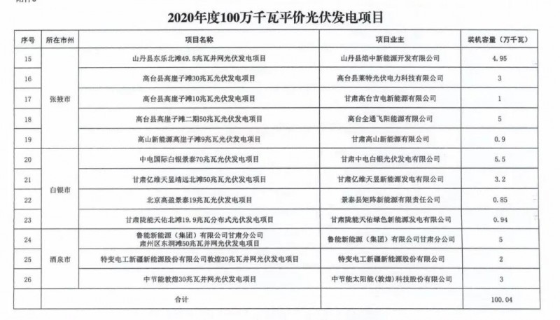 3月25日,甘肅省發改委發布《關于加快推進全省新能源存量項目建設工作》的通知。文件明確,甘肅省目前新能源存量項目約600萬千瓦。其中,光伏發電項目1.23GW包括:酒湖直流工程配套23.5萬千瓦光伏發電項目以及《國家發展改革委辦公廳國家能源局綜合司關于公布2020年風電、光伏發電平價上網項目的通知》(發改辦能源〔2020〕588號)中尚未并網100萬千瓦光伏發電項目。