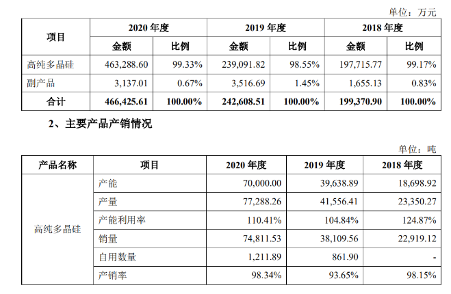 根據硅業分會數據,2020 年度國內多晶硅產量約為 39.6 萬噸,該公司對應期間的多晶硅產量為 7.73 萬噸,占國內多晶硅產量的 19.52%;2020 年度國內單晶硅片用料產量為 32.6 萬噸,占國內多晶硅產量的 82.4%,該公司在占據主流的單晶硅片用料的市占率為 22.68%。