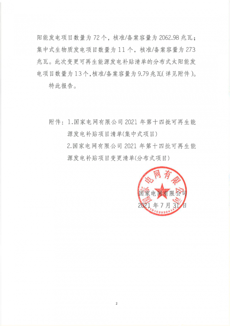 2021年7月31日,我公司已將完成公示的2021年第十四批可再生能源發電項目補貼項目清單上報國家主管部門,第十四批項目清單及后續項目審核進展情況,請登錄新能源云平臺查詢。