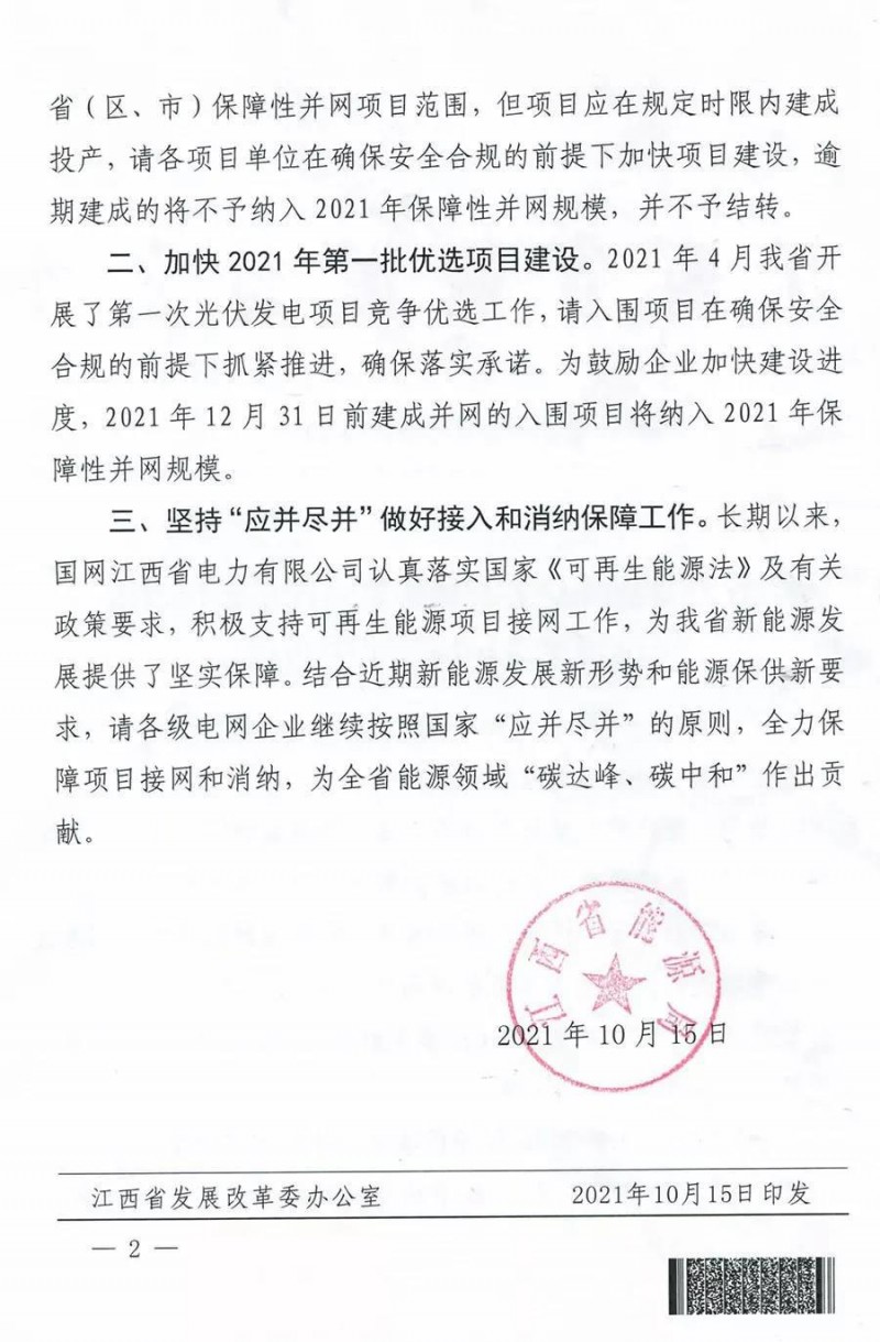 通知要求,各項(xiàng)目單位在確保安全合規(guī)的前提下加快項(xiàng)目建設(shè),逾期建成的將不予納入2021年保障性并網(wǎng)規(guī)模,并不予結(jié)轉(zhuǎn)。為鼓勵(lì)企業(yè)加快建設(shè)進(jìn)度,2021年12月31日前建成并網(wǎng)的入圍項(xiàng)目將納入2021年保障性并網(wǎng)規(guī)模。