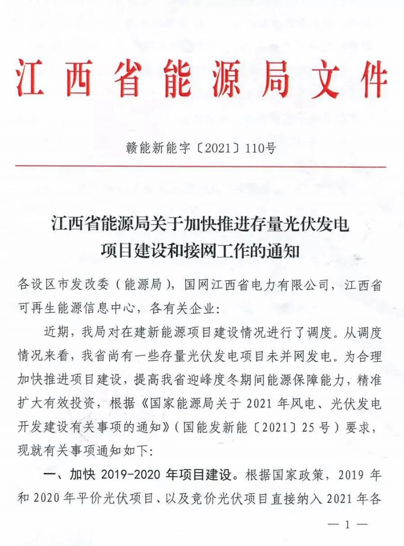 江西省能源局日前印發(fā)《關(guān)于加快推進(jìn)存量光伏發(fā)電項(xiàng)目建設(shè)和接網(wǎng)工作的通知》明確提出,堅(jiān)持“應(yīng)并盡并”做好接入和消納保障工作,加快2019-2020年項(xiàng)目建設(shè),加快2021年第一批優(yōu)選項(xiàng)目建設(shè)。