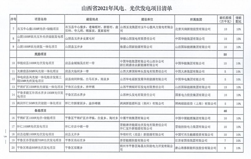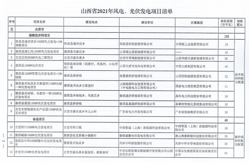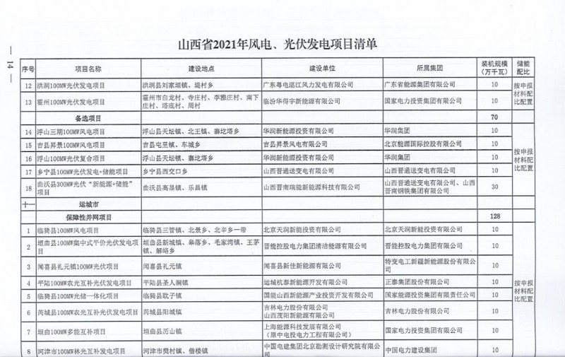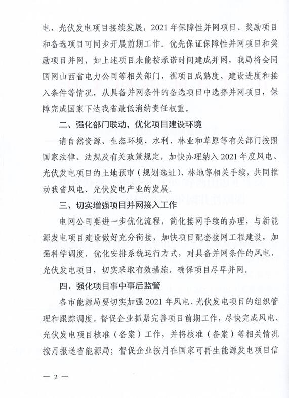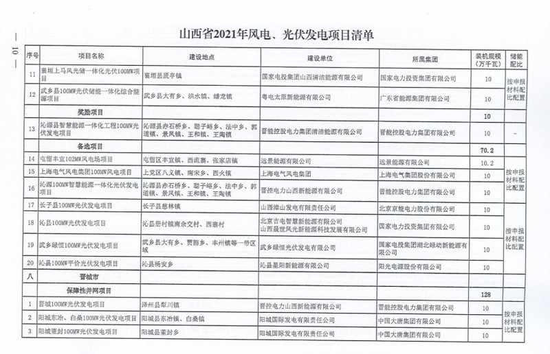 10月22日,山西省能源局下達(dá)2021年度風(fēng)電、光伏發(fā)電保障性并網(wǎng)年度建設(shè)計(jì)劃。風(fēng)、光合計(jì)17.792GW,其中保障性11.2GW+獎(jiǎng)勵(lì)700MW+備選5.892GW。文件明確保障性規(guī)模與獎(jiǎng)勵(lì)規(guī)模可同步開(kāi)展前期工作,優(yōu)先保證保障性并網(wǎng)項(xiàng)目和獎(jiǎng)勵(lì)項(xiàng)目并網(wǎng),如上述項(xiàng)目未能按承諾時(shí)間并網(wǎng),將視項(xiàng)目成熟度、建設(shè)進(jìn)度和接入條件等,從備選項(xiàng)目中選擇并網(wǎng)項(xiàng)目,保障完成國(guó)家下達(dá)的最低消納責(zé)任權(quán)重。