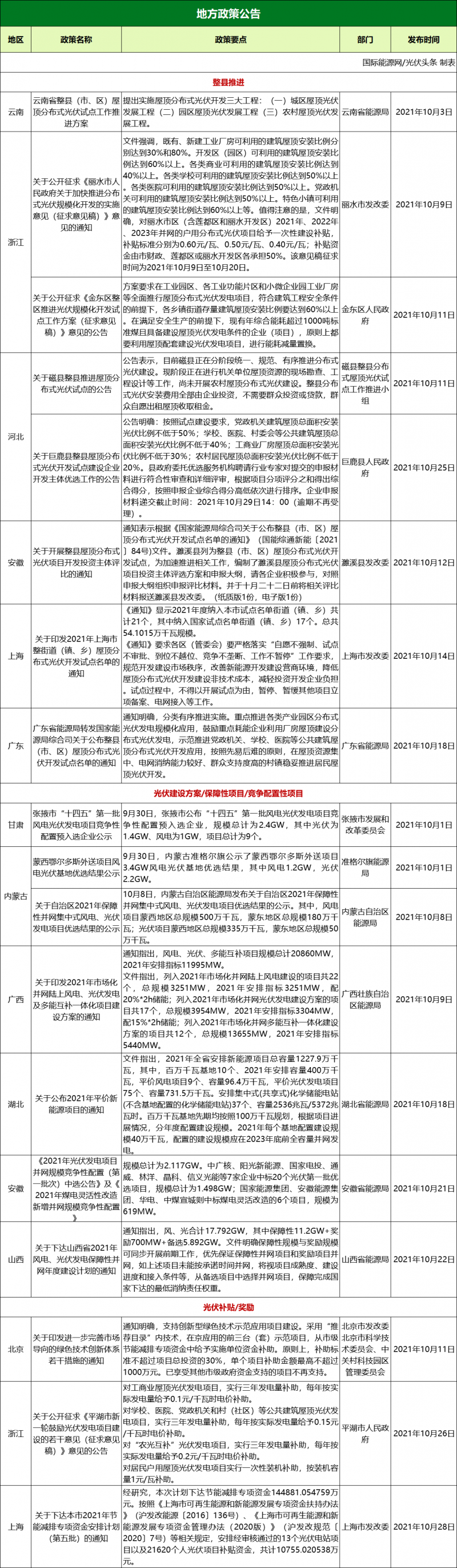 繼在9月國家能源局公布整縣(市、區)屋頂分布式光伏開發試點名單的大背景下,10月份云南、浙江麗水市、浙江金華市金東區、河北磁縣、河北巨鹿縣、安徽濉溪縣、上海、廣東等8地出臺了整縣推進屋頂分布式光伏相關政策。