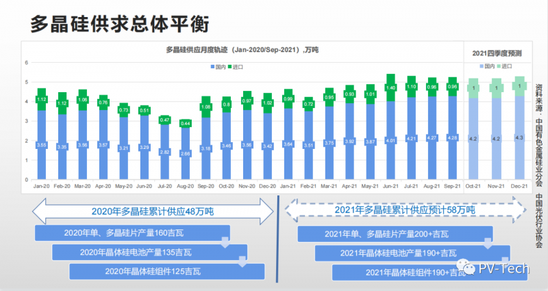 呂錦標在報告里也公布了全球7家主要企業和4家新進入企業的擴產情況,預測2022年多晶硅供應可以超過80萬噸,比今年增加20萬噸。主要產能集中在下半年投產。對應明年200吉瓦的裝機預測,多晶硅供應大于需求。有望推動價格下行。