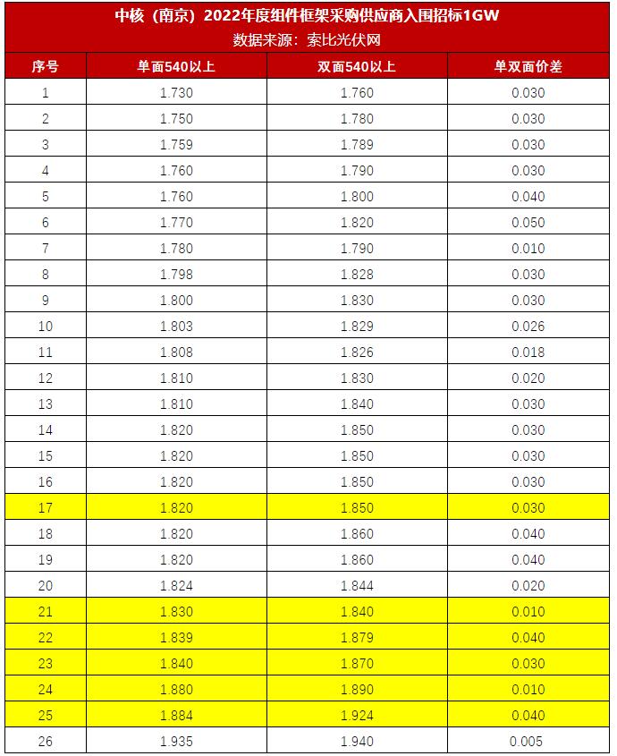 1月19日,中核(南京)2022年度1GW光伏組件框架采購供應商入圍招標正式開標。索比光伏網獲悉,本次共26家企業提供報價,單面組件最低報價1.73元/W,最高報價1.935元/W,平均1.811元/W。雙面組件最低報價1.76元/W,最高報價1.94元/W,平均1.839元/W。多數企業單、雙面價差在0.03元/W左右。