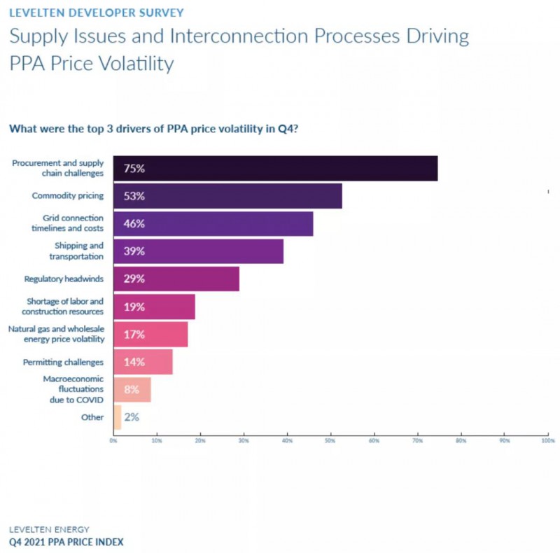 上述創紀錄的太陽能光伏的采購是在光伏成本上升的情況下發生的。LevelTen Energy的一項調查表明,由于需求增加、宏觀經濟波動、供應鏈問題以及其他因素的影響,光伏成本從 2020 年初開始上漲。據LevelTen Energy 的最新報告, 2021 年第四季度購電協議( PPA) 價格指數顯示光伏價格上漲了 5.7%,達到34.25 美元/兆瓦時。
