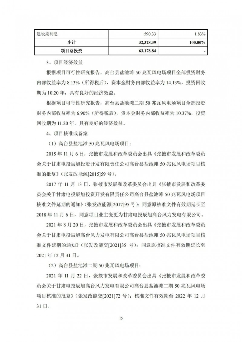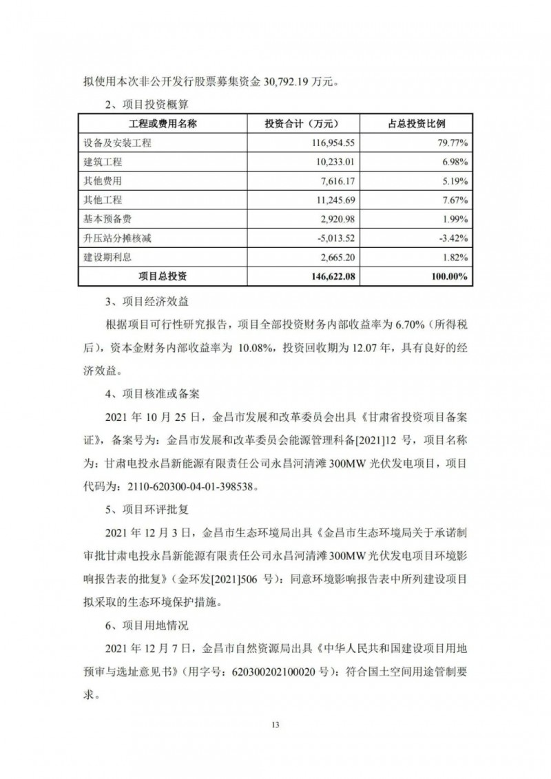2月21日,甘肅電投發布公告,擬定增募資不超過12億元,用于玉門市麻黃灘第一風電場C區200兆瓦項目、瓜州干河口200MW光伏項目、永昌河清灘300MW光伏發電項目、高臺縣鹽池灘100MW風電場項目及補充流動資金。天眼查app顯示,公司是于1997年7月8日經甘肅省人民政府甘政函[1997]36號文件批準,由西北油漆廠獨家發起,部分改制,采用募集設立方式設立的股份有限公司。公司1997年8月29日向社會公眾公開發行4500萬股人民幣普通股,并于1997年9月23在甘肅省工商行政管理局登記注冊。1997年10月14日經中國證券監督管理委員會批準,公司股票在深圳證券交易所上市交易。自2012年12月21日起,公司名稱由"西北永新化工股份有限公司"變更為"甘肅電投能源發展股份有限公司"。