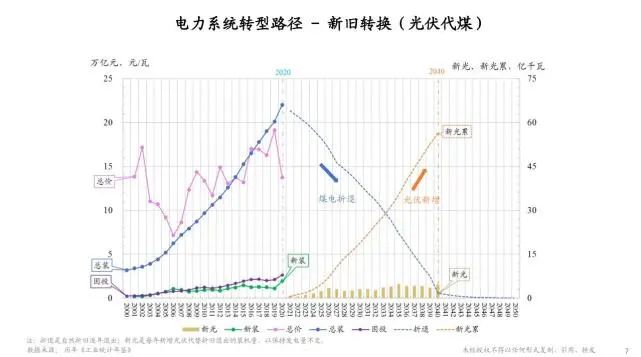 下面我們談一下,如果經過進一步論證,證明光伏能源作為一個可再生能源,有足夠大的規模可以替代煤炭做能源的基礎,我們應該怎么轉型?下面這張圖上左邊這一半實際上是2000年到2020年整個電力企業的裝機總量在不斷累積增加,今天大約有70%的發電還是用火電的技術設備。