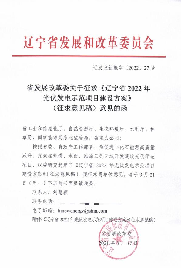 3月17日,遼寧省發展改革委關于征求《遼寧省2022年光伏發電示范項目建設方案》(征求意見稿)意見的函。