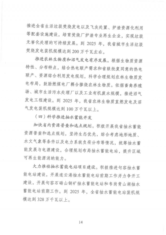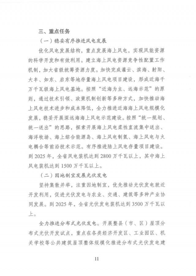● 擴大可再生能源裝機規(guī)模:到2025年,全省可再生能源裝機力爭達到6600萬千瓦以上,省內(nèi)可再生能源裝機占總裝機比重超過34%。其中,風電裝機達到2800萬千瓦以 上,光伏發(fā)電裝機達到 3500 萬千瓦以上,生物質發(fā)電裝機達到300萬千瓦以上,另外,抽水蓄能裝機達到328萬千瓦 以上,實現(xiàn)電力裝機結構有新跨越。