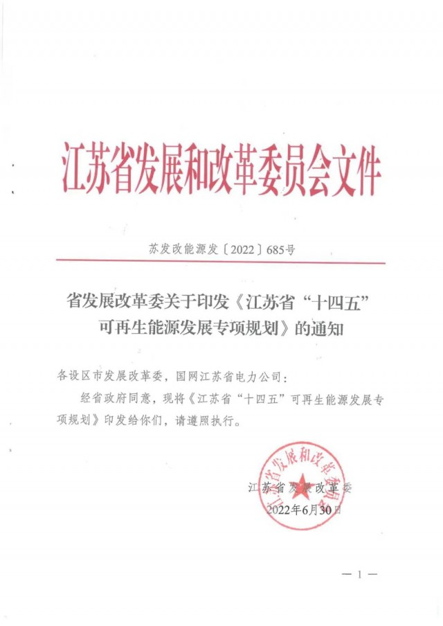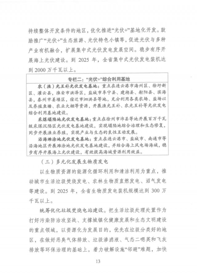 “十四五”期間,江蘇將穩(wěn)妥有序推進風電發(fā)展,優(yōu)化風電發(fā)展結構,重點發(fā)展海上風電,因地制宜發(fā)展光伏發(fā)電,全力推進分布式光伏發(fā)電,穩(wěn)步有序開展海上光伏建設,加快推進“光伏+”綜合利用,多元化發(fā)展生物質發(fā)電,科學推進抽水蓄能開發(fā),高效多元推動非電利用。到2025年,省內(nèi)可再生能源占全省能源消費總量比重將達到15%以上,全省可再生能源裝機達到6600萬千瓦以上,占總裝機比重超過34%。其中,風電裝機達到2800萬千瓦以上,光伏發(fā)電裝機達到3500萬千瓦以上,生物質發(fā)電裝機達到300萬千瓦以上。