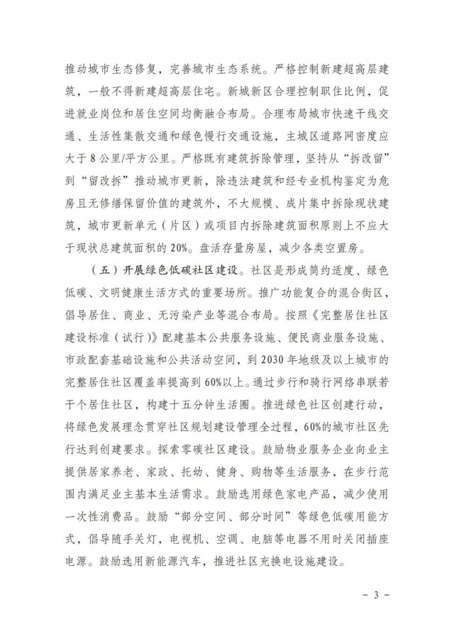 《方案》提出開展綠色低碳社區建設。推廣功能復合的混合街區,倡導居住、商業、無污染產業等混合布局。按照《完整居住社區建設標準(試行)》配建基本公共服務設施、便民商業服務設施、市政配套基礎設施和公共活動空間,到2030年地級及以上城市的完整居住社區覆蓋率提高到60%以上。通過步行和騎行網絡串聯若干個居住社區,構建十五分鐘生活圈。推進綠色社區創建行動,將綠色發展理念貫穿社區規劃建設管理全過程,60%的城市社區先行達到創建要求。探索零碳社區建設。鼓勵物業服務企業向業主提供居家養老、家政、托幼、健身、購物等生活服務,在步行范圍內滿足業主基本生活需求。鼓勵選用綠色家電產品,減少使用一次性消費品。鼓勵“部分空間、部分時間”等綠色低碳用能方式,倡導隨手關燈,電視機、空調、電腦等電器不用時關閉插座電源。鼓勵選用新能源汽車,推進社區充換電設施建設。