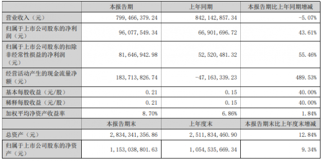 8月19日晚間,精功科技發布2022年半年度報告,報告期內,公司營業收入799,466,379.24元,同比下降5.07%,歸屬于上市公司股東的凈利潤96,077,549.34元,同比增加43.61%,詳情如下: