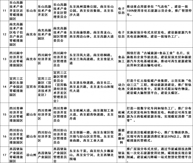 四川省近零碳排放園區試點擬確定名單(含試點園區名稱、所屬地區、所屬園區、申報主體、試點范圍、主導產業、試點特色),共17家園區。