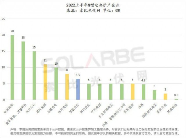 注:圖表綠色代表異質(zhì)結(jié)、黃色代表TOPCon、藍(lán)色代表N型