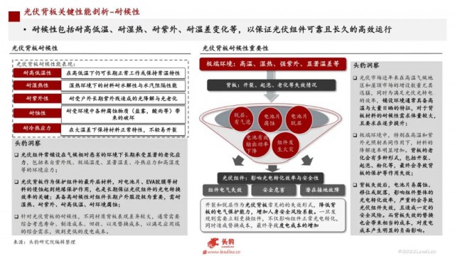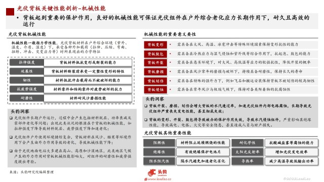 光伏組件常鋪設在氣候相對惡劣的環境下長期承受顯著的老化應力,包括來自紫外線、極端溫度、顯著溫差、冷熱應力和高濕度等的環境應力;光伏背板作為保護組件的最外層材料,對電池片、EVA膠膜等材料的侵蝕起到絕緣保護作用,也是長期保證光伏組件的光電轉換效率的關鍵;具備高耐候性對組件長期戶外服役極為重要,需耐濕熱、耐紫外、耐高低溫、耐環境腐蝕;針對光伏背板的耐候性,不同材質背板表現差異較大,通常需要綜合考慮壽命、制造成本、回收、以及替換成本,以滿足應用端的綜合需求,做到更低的度電成本。