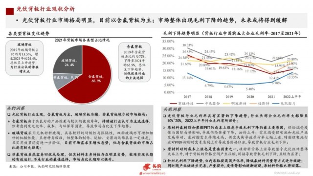光伏背板廣泛應用于太陽能電池(光伏)組件,在國家政策的整體推動下,光伏產業進入爆發式增長階段,同時將帶動背板行業的快速發展與規模擴張。目前背板行業整體呈現,含氟背板為主,玻璃背板為輔,非氟背板較少的市場格局。近年光伏背板行業毛利率具有顯著的下降趨勢,行業頭部5家企業最低已降至10%以下,主要由原材料成本上漲導致,企業積極采取應對措施,趨勢或將得到緩解。