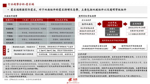 需求端根據實際需求,對于雙面組件的需求持增長態勢,主要包括雙玻組件以及透明背板組件。