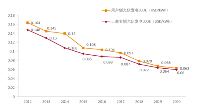 圖:2012-2020光伏發電度電成本下降趨勢,來源:天風證券