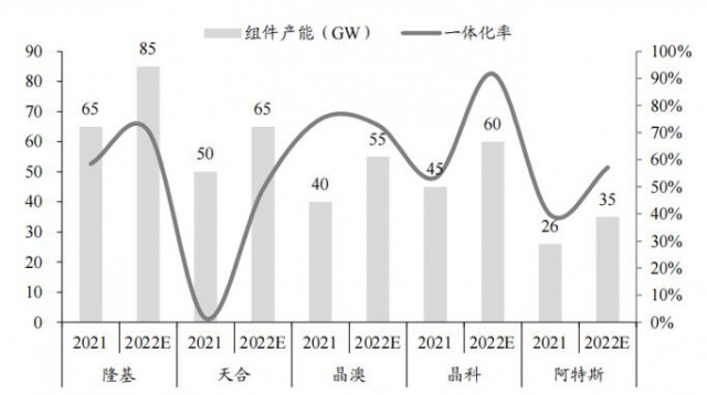 圖:組件龍頭組件產能及一體化率對比(GW,%),來源:CPIA,東吳證券研究所