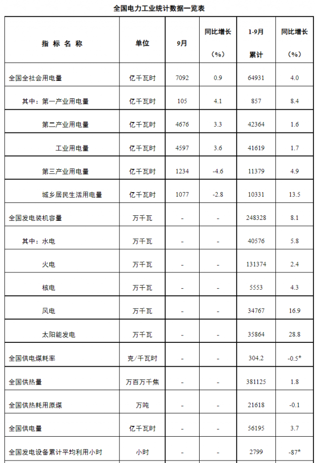 10月24日,國家能源局發布1-9月份全國電力工業統計數據。