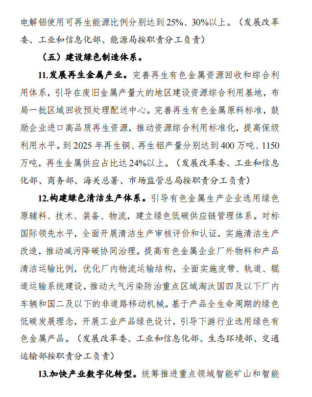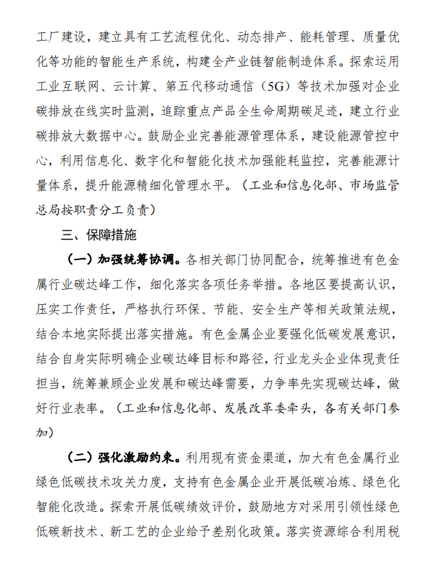 11月15日,工業(yè)和信息化部、國家發(fā)展和改革委員會和生態(tài)環(huán)境部發(fā)布《關(guān)于印發(fā)有色金屬行業(yè)碳達(dá)峰實施方案的通知》,(以下簡稱通知)通知指出,控制化石能源消費。推進(jìn)有色金屬行業(yè)燃煤窯爐以電代煤,提升用能電氣化水平。在氣源有保障、氣價可承受的條件下有序推進(jìn)以氣代煤。推動落后自備燃煤機組淘汰關(guān)?;虿捎们鍧嵢剂咸娲?。嚴(yán)禁在國家政策允許的領(lǐng)域以外新(擴)建燃煤自備電廠,推動電解鋁行業(yè)從使用自備電向網(wǎng)電轉(zhuǎn)化。支持企業(yè)參與光伏、風(fēng)電等可再生能源和氫能、儲能系統(tǒng)開發(fā)建設(shè)。加強企業(yè)節(jié)能管理,嚴(yán)格落實國家強制性節(jié)能標(biāo)準(zhǔn),持續(xù)開展工業(yè)節(jié)能監(jiān)察,規(guī)范企業(yè)用能行為。