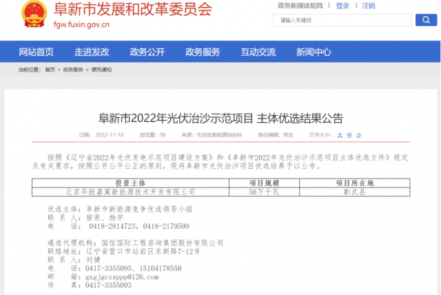 按照《遼寧省2022年光伏發電示范項目建設方案》和《阜新市2022年光伏治沙示范項目主體優選文件》規定及有關要求,按照公開公平公正的原則,現將阜新市光伏治沙項目優選結果予以公布。