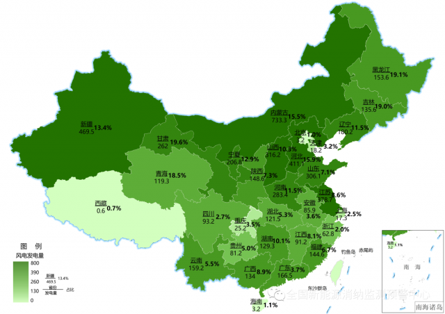 截至9月底累計風電發電量(億千瓦時)及占本地區總發電量比重