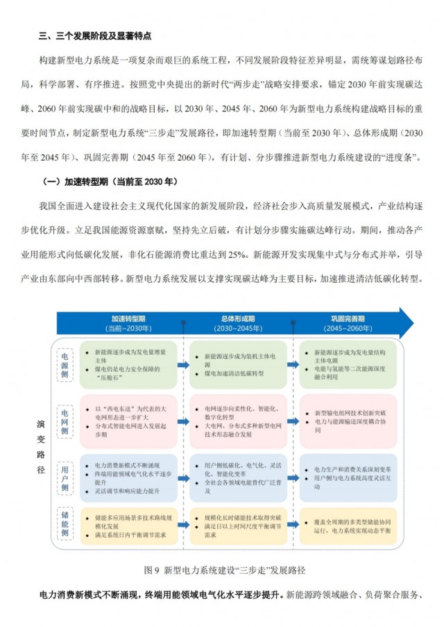 按照黨中央提出的新時代“兩步走”戰略安排要求,錨定2030年前實現碳達峰、2060年前實現碳中和的戰略目標,以2030年、2045年、2060年為新型電力系統構建戰略目標的重要時間節點,制定新型電力系統“三步走”發展路徑,即加速轉型期(當前至2030年)、總體形成期(2030年至2045年)、鞏固完善期(2045年至2060年),有計劃、分步驟推進新型電力系統建設的“進度條”。