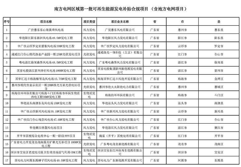 南方電網關于公布第一批可再生能源發電補貼合規項目清單的公告