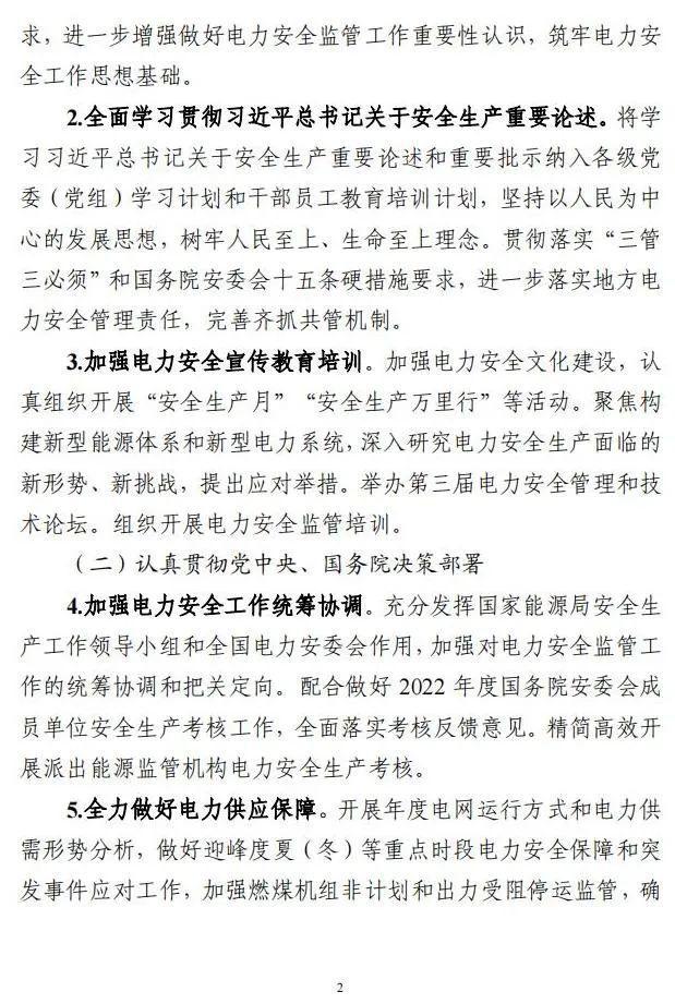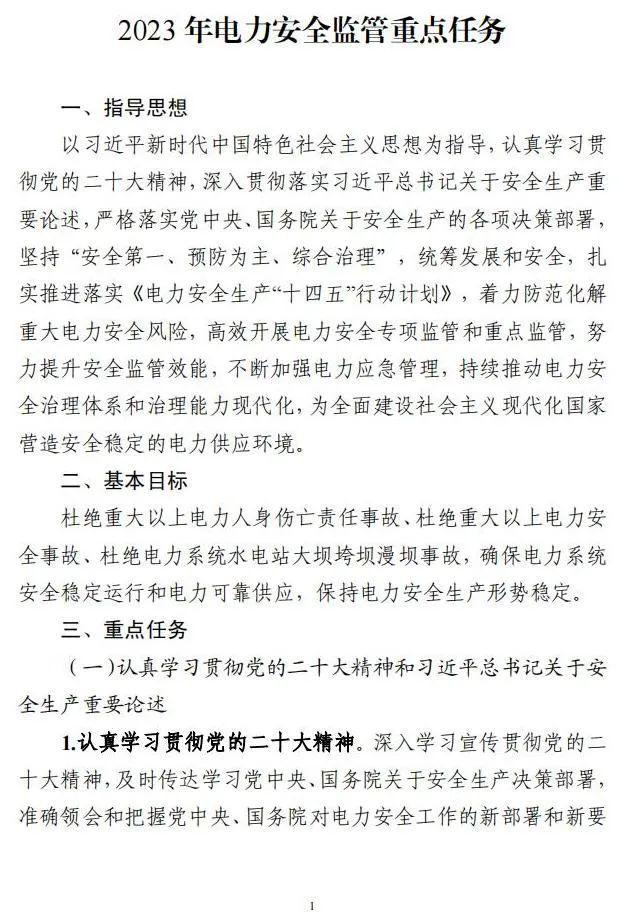 為貫徹落實(shí)黨的二十大精神,扎實(shí)做好2023年電力安全監(jiān)管工作,確保電力系統(tǒng)安全穩(wěn)定運(yùn)行和電力可靠供應(yīng),推動(dòng)全國(guó)電力安全生產(chǎn)形勢(shì)持續(xù)穩(wěn)定向好,我局制定了《2023年電力安全監(jiān)管重點(diǎn)任務(wù)》。現(xiàn)印發(fā)給你們,請(qǐng)結(jié)合本地區(qū)、本單位實(shí)際,認(rèn)真貫徹落實(shí)。