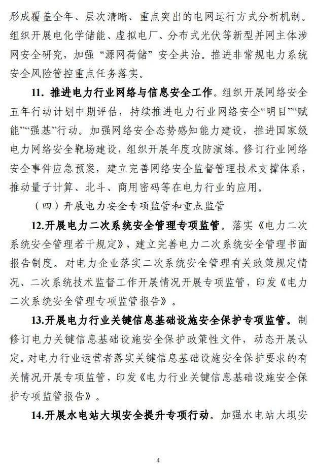加強(qiáng)電網(wǎng)安全風(fēng)險(xiǎn)管控。完善電網(wǎng)運(yùn)行方式分析制度,形成覆蓋全年、層次清晰、重點(diǎn)突出的電網(wǎng)運(yùn)行方式分析機(jī)制。組織開(kāi)展電化學(xué)儲(chǔ)能、虛擬電廠、分布式光伏等新型并網(wǎng)主體涉網(wǎng)安全研究,加強(qiáng)“源網(wǎng)荷儲(chǔ)”安全共治。推進(jìn)非常規(guī)電力系統(tǒng)安全風(fēng)險(xiǎn)管控重點(diǎn)任務(wù)落實(shí)。