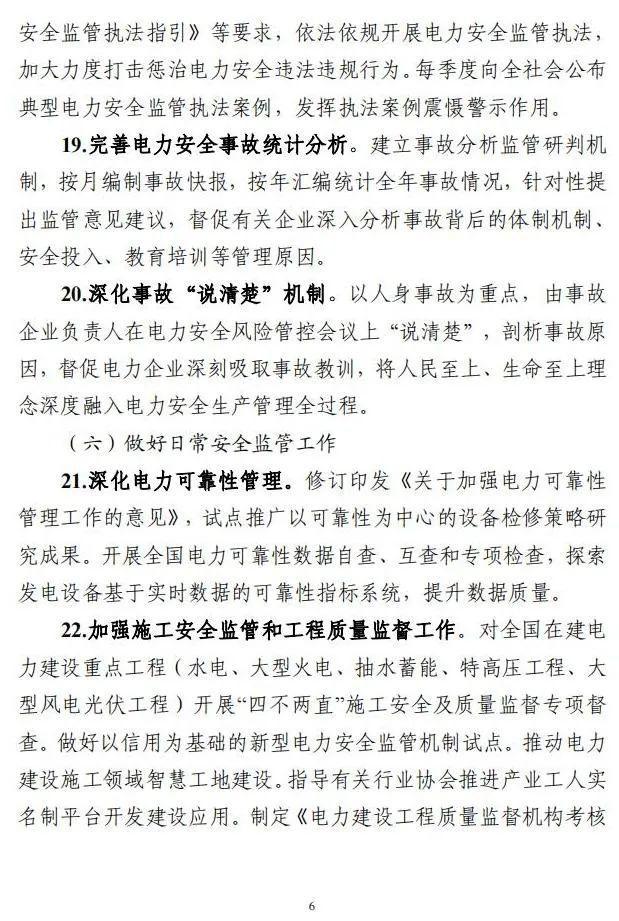加強(qiáng)施工安全監(jiān)管和工程質(zhì)量監(jiān)督工作。對(duì)全國(guó)在建電力建設(shè)重點(diǎn)工程(水電、大型火電、抽水蓄能、特高壓工程、大型風(fēng)電光伏工程)開(kāi)展“四不兩直”施工安全及質(zhì)量監(jiān)督專(zhuān)項(xiàng)督查。做好以信用為基礎(chǔ)的新型電力安全監(jiān)管機(jī)制試點(diǎn)。