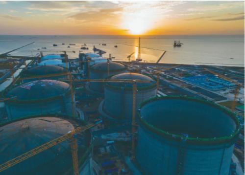 中海油鹽城綠能港一期擴建工程10號LNG儲罐順利升頂到位。