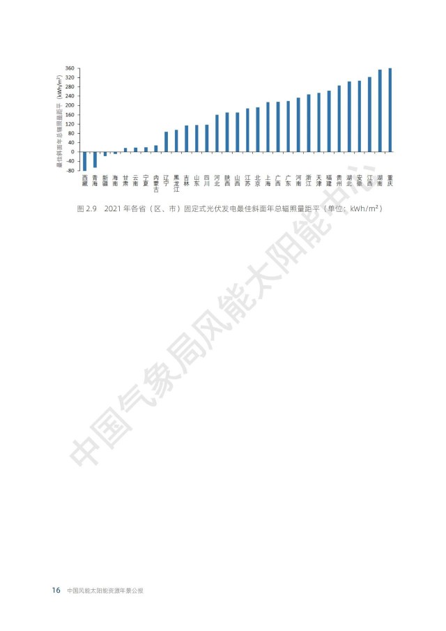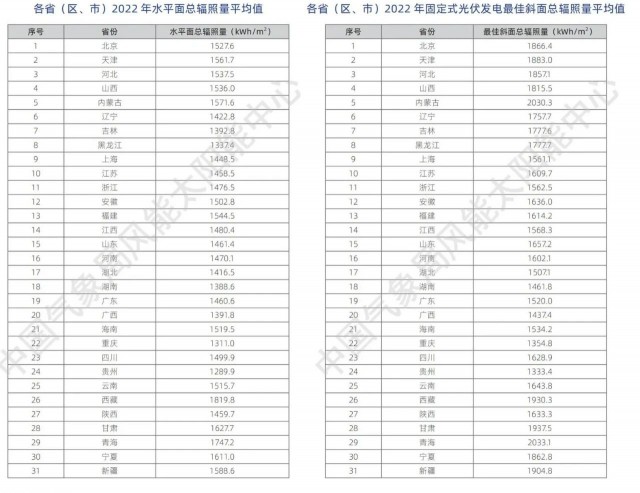 上圖為全國平均值,具體到各個省份的年水平面總輻射量、年傾斜面面總輻射量數值如下表所示。