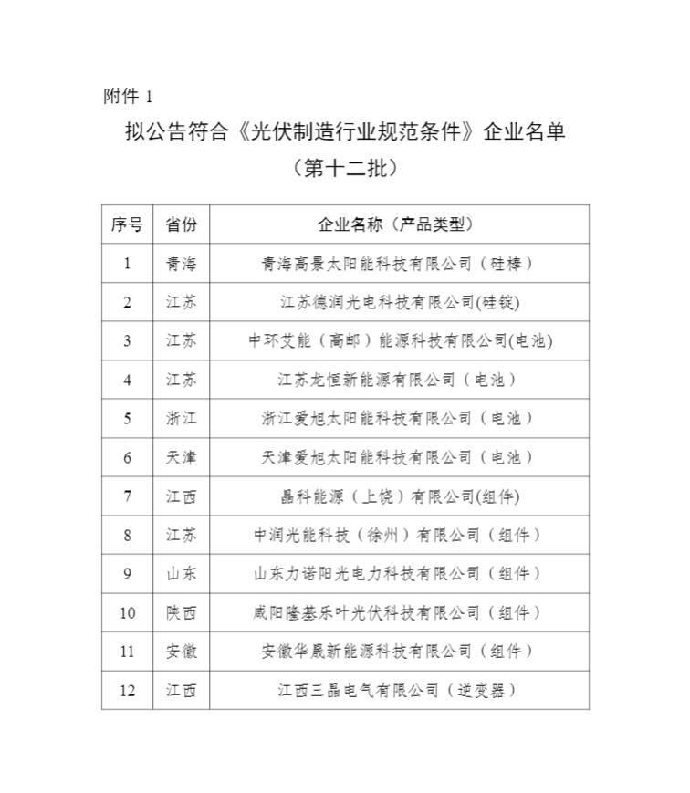 擬公告符合《光伏制造行業規范條件》企業名單(第十二批)