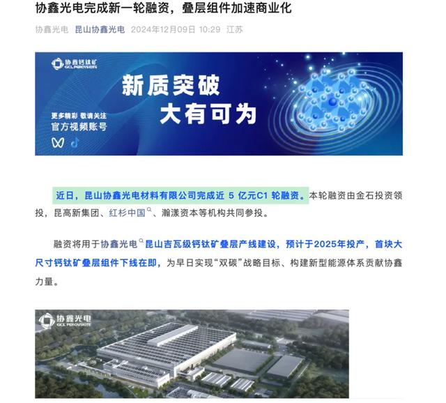 就在12月初,協鑫集團旗下鈣鈦礦業務核心企業——昆山協鑫光電材料有限公司(下稱“協鑫光電”)宣布,公司已經完成近5億元C1輪融資。該輪融資由金石投資領投,昆高新集團、紅杉中國、瀚漾資本等機構共同參投。光源資本擔任本輪融資獨家財務顧問。