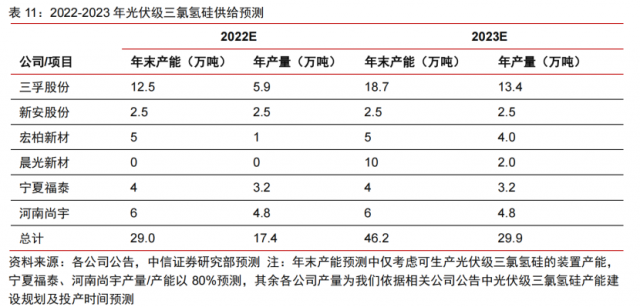 中信證券王喆在10月11日發(fā)布的研報(bào)中表示,根據(jù)2022-2023年多晶硅廠家擴(kuò)產(chǎn)計(jì)劃,2022Q4季度與2023Q2季度將迎來(lái)硅料產(chǎn)能釋放密集期,可能會(huì)存在光伏級(jí)三氯氫硅出現(xiàn)短暫的供給缺口,屆時(shí)有望提振三氯氫硅價(jià)格,預(yù)計(jì)三氯氫硅高景氣度有望維持至2023Q2。