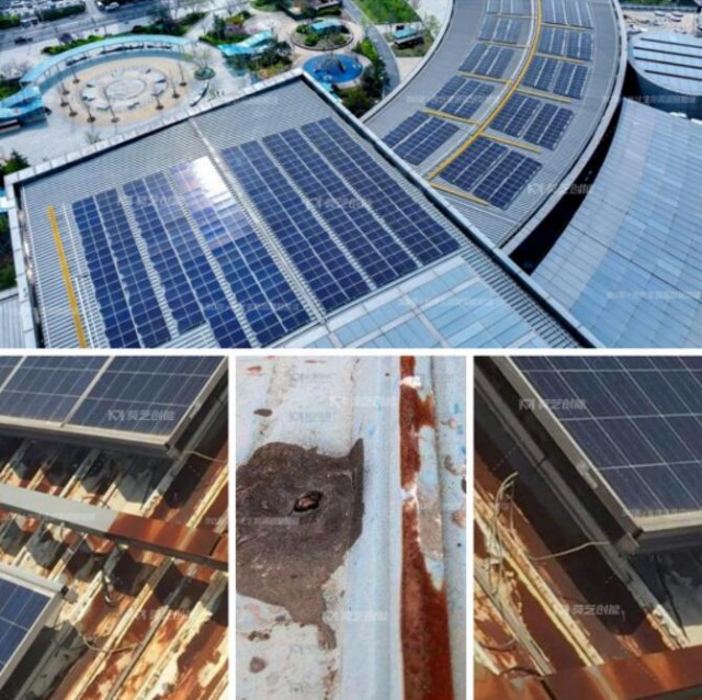 若只依靠彩鋼瓦本身的屋面,很容易因為涂層厚度不夠,加之紫外線、雨水、光合作用等自然因素的侵蝕,造成屋面彩鋼瓦接縫處開裂、鉚釘松動生銹、屋面銹蝕擴大、瓦脊銹蝕銹穿導致屋面出現(xiàn)滲水漏水的情況。同時因其坡度小,可能會造成雨水排泄不暢、積水超過彩鋼瓦接縫高度或鉚釘孔高度及溝沿瓦而導致銹損滲漏。而工廠生產(chǎn)過程中排放的酸性、堿性等氣體長期與屋面接觸,也會腐蝕鋼結(jié)構(gòu),加速銹蝕、穿孔導致滲漏。