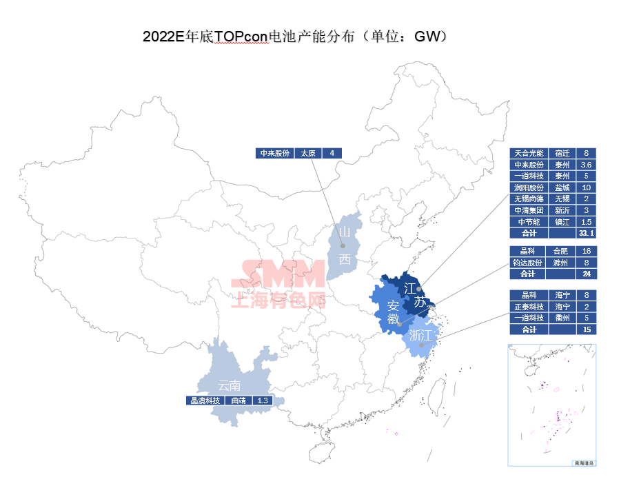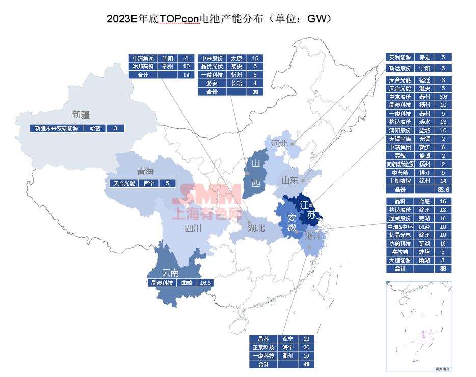 SMM整理了今明年的Topcon電池產能地域分布如下圖示: